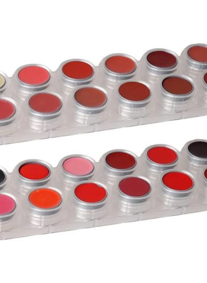 Lippenstift palet van het merk Grimas. Dit palet bestaat uit de volgende kleuren: base, zachtrood, oranjerood, licht steenrood, donker bordeaux, lever, licht aubergine, mix 22-23, bruin, middelbruin, donkerbruin, roodbruin, zwart, felrood, roze, dieprood, bordeaux, oudrood, cyclaam, licht oranje, oranjerood, violetrood, dieprood en rood.