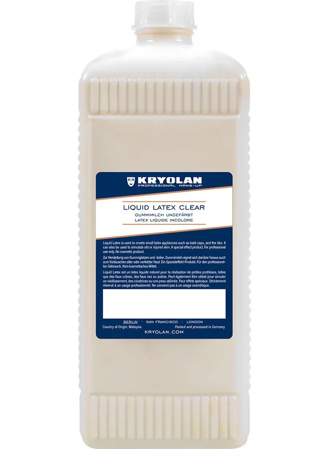 Kryolan Liquid Latex Clear is een gevulkaniseerde vloeibare latex (latexmelk) met slechts een kleine hoeveelheid ammonia. Met Liquid Latex kunt u leuke grime special effects creëren op uw huid, zoals spectaculaire wonden of rimpels. Ook kan deze Liquid Latex gebruikt worden voor kleine protheses zoals neuzen, kinnen, wonden en kale hoofden (kaalkoppen).