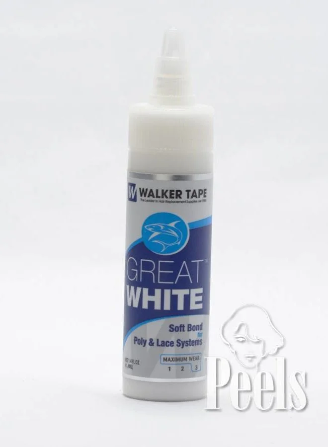 Great White lijm van de Amerikaanse producent Walker Tape is een watergedragen pruikenlijm van hoge kwaliteit. Deze lijm is ook geschikt voor het bevestigen van haarwerken, haarstukjes en toupets. Deze haarwerklijm is sterk (maximale houdbaarheid) en droogt helder op. U kunt rekenen op een houdbaarheid van ongeveer 4 weken, maar dit is uiteraard wel afhankelijk van onder meer gebruik, klimaat en levenswijze. Daarnaast heeft Great White haarwerklijm een antibacteriële werking waardoor het langer fris blijft.